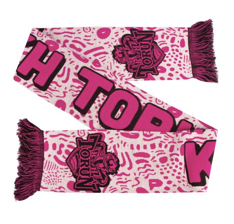 The intense pink colour scheme, combined with contrasting details and large "KH TORUŃ" lettering, makes the scarf instantly eye-catching.