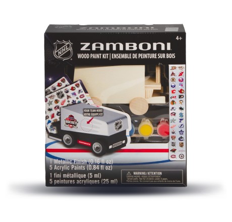 - It includes 1 wood Zamboni, 2 sticker sheets, 1 stencil sheet, 5 non-toxic acrylic paint tubs, 1 non-toxic metallic silver finishing paint, 1 flat-tipped artist-quality wooden paintbrush,
