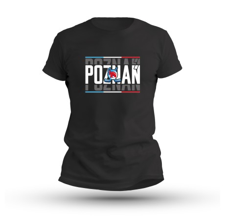 - The black color provides the perfect background for the dynamic “Poznań” graphic with the Koziołki logo placed at the center, enhanced with subtle color accents.