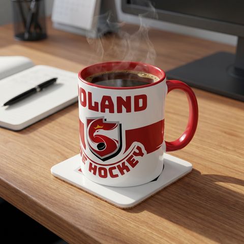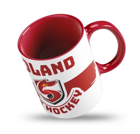 - The mug features a red-and-white color scheme with a bold “Poland Hockey” graphic and modern logo. The red interior and handle add a dynamic, sporty touch.