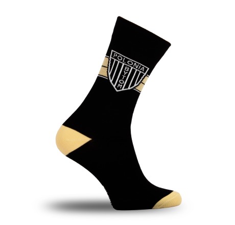 The black background, broken up by gold accents and the distinctive Polonia Bytom symbol, gives the socks a modern, prestigious look.