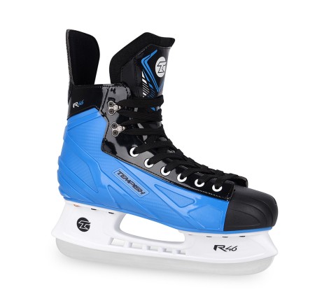 Special hockey skates TEMPISH RENTAL R46T are designed for rentals and are suitable for advanced skaters.MATERIALSkate shell has a unique construction, is made of one piece of composite resistant plastic, ensures variable hardness for optimal foot fixation. The skeleton is very light, yet strong and durable. The skeleton is very well anatomically shaped, especially in the area of the Achilles tendon and ankles. The skeleton provides very good support and protection of the ankles.LINERFoam lining, especially in the area of ankles and Achilles tendon, and anatomical insert, which fixes the foot well in the skate, provide comfort. The tongue has an anatomical shape, it is moderately reinforced. The tongue consists of two parts, ensuring a comfortable fit of the instep, ankle and lower shin. In the upper 2 positions, the eyelets were replaced by reinforced hooks attached to the shoe with a special nut, which is covered with a lining and therefore not visible from the inside of the shoe to ensure maximum comfort. The hooks are not riveted, but screwed.The inner material is made of CAMBRA material, which is abrasion-resistant and insulated, ensuring a stable fixation of the foot in the skate and which is designed to withstand daily use in rental. It also effectively wicks away moisture and dries well after skating.The skate is fitted with a high-quality stainless steel blade. The holder is attached to the skate with 10 steel rivets and 4 copper rivets. Size marking on the heel facilitates handling and speeds up the work of rental staff!